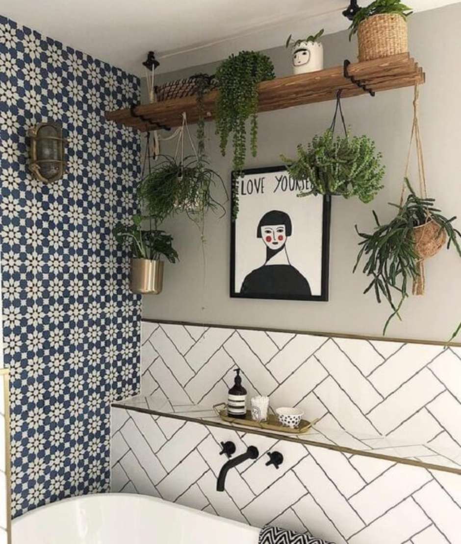 44. Vasos suspensos na parede trazem um toque natural para o banheiro.