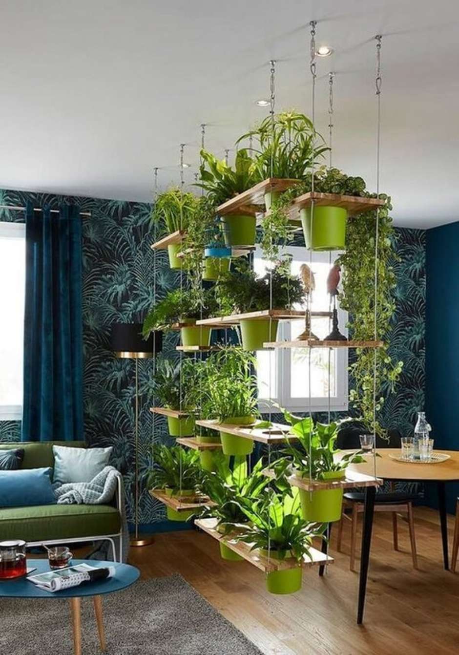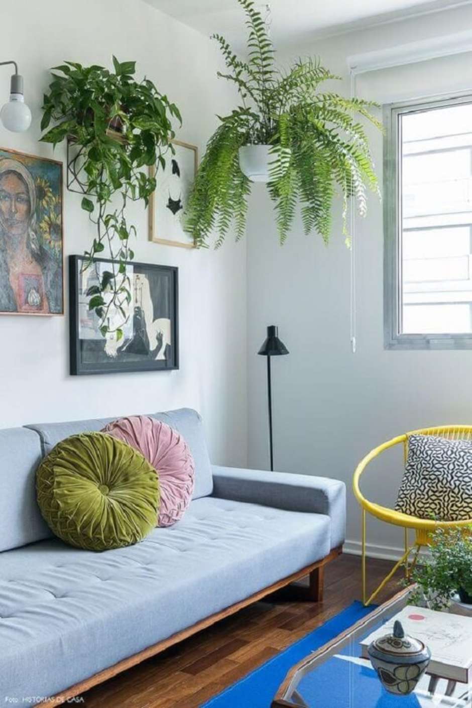 17. Os vasos suspensos para plantas deixam a sala de estar charmosa.