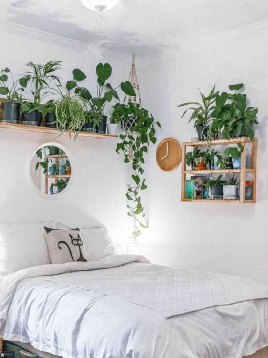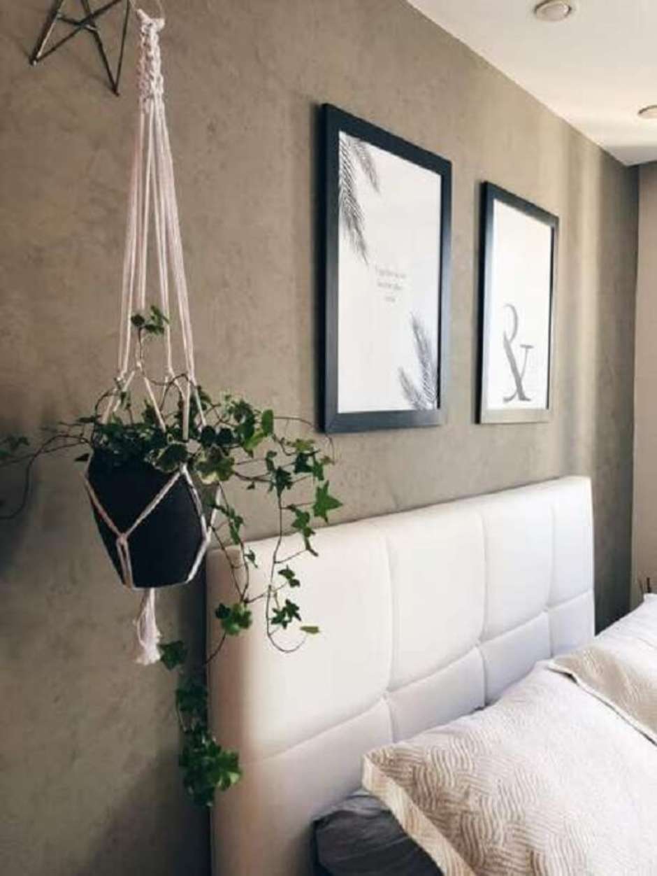 21. O suporte para vaso suspenso delicado traz muito charme para esse quarto.