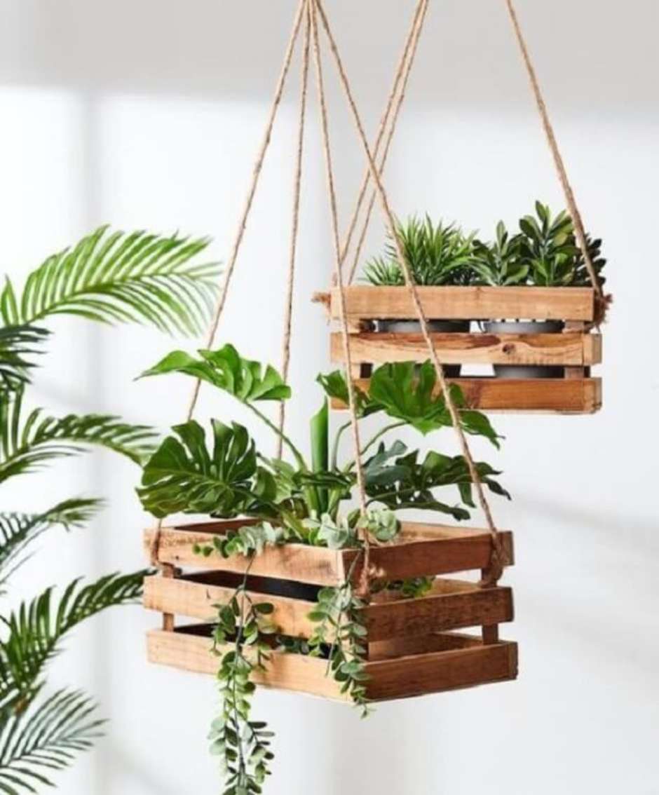 47. Caixotes de feira servem de suporte para vaso suspenso.