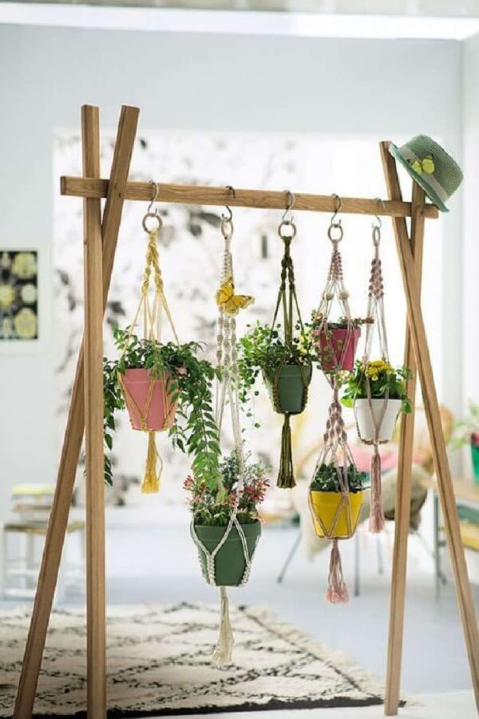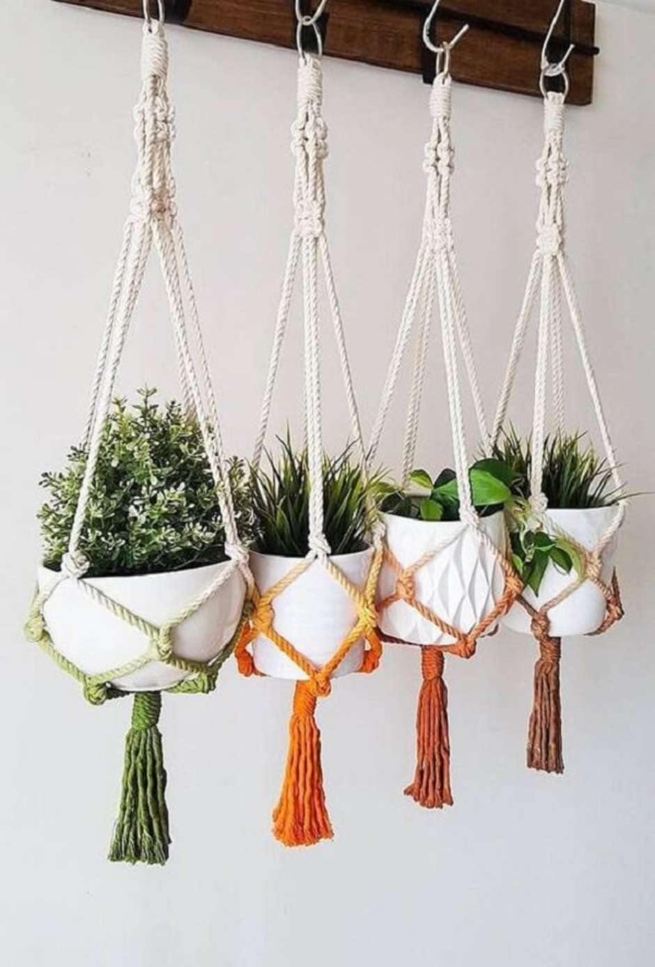 41. Vasos suspensos na parede em macramê colorido.