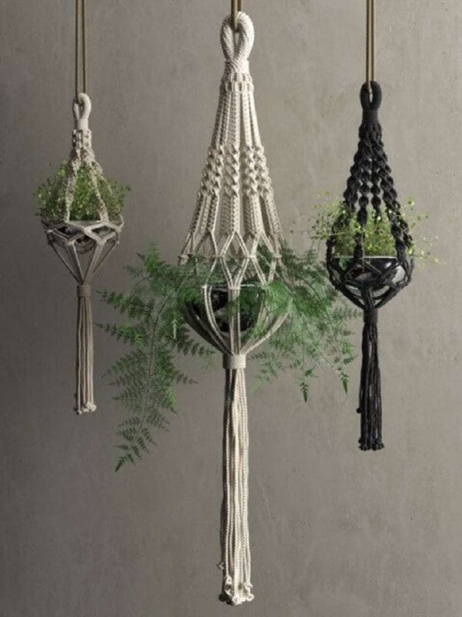 23. Macramês preto e branco são perfeitos para vasos para jardim suspenso.
