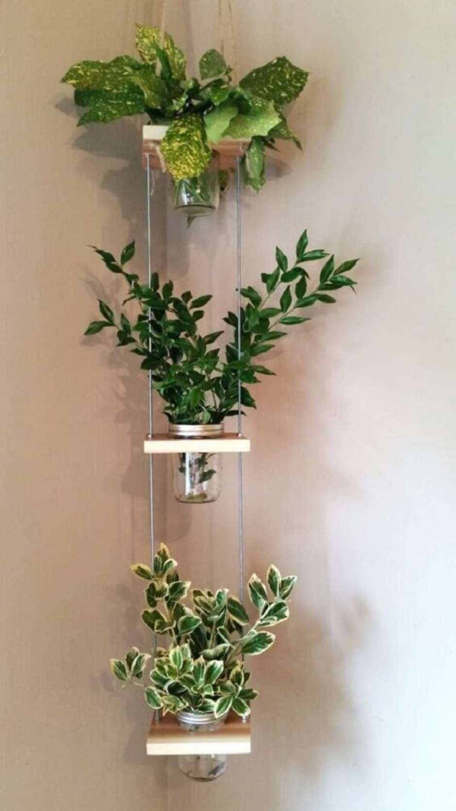 40. Os vasos suspensos na parede trazem frescor para a decoração.