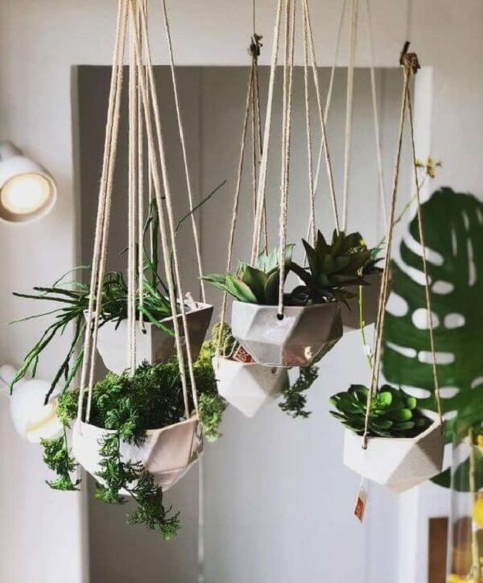 35. As cordas fixadas no teto ajudam a manter os vasos para jardim suspenso.