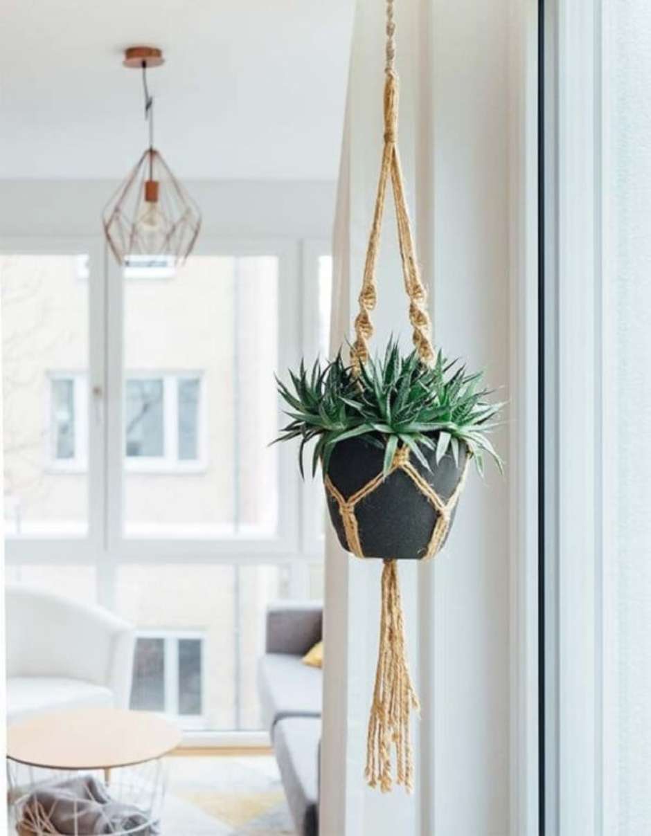 51. Suporte para vaso suspenso feito com a técnica de macramê.